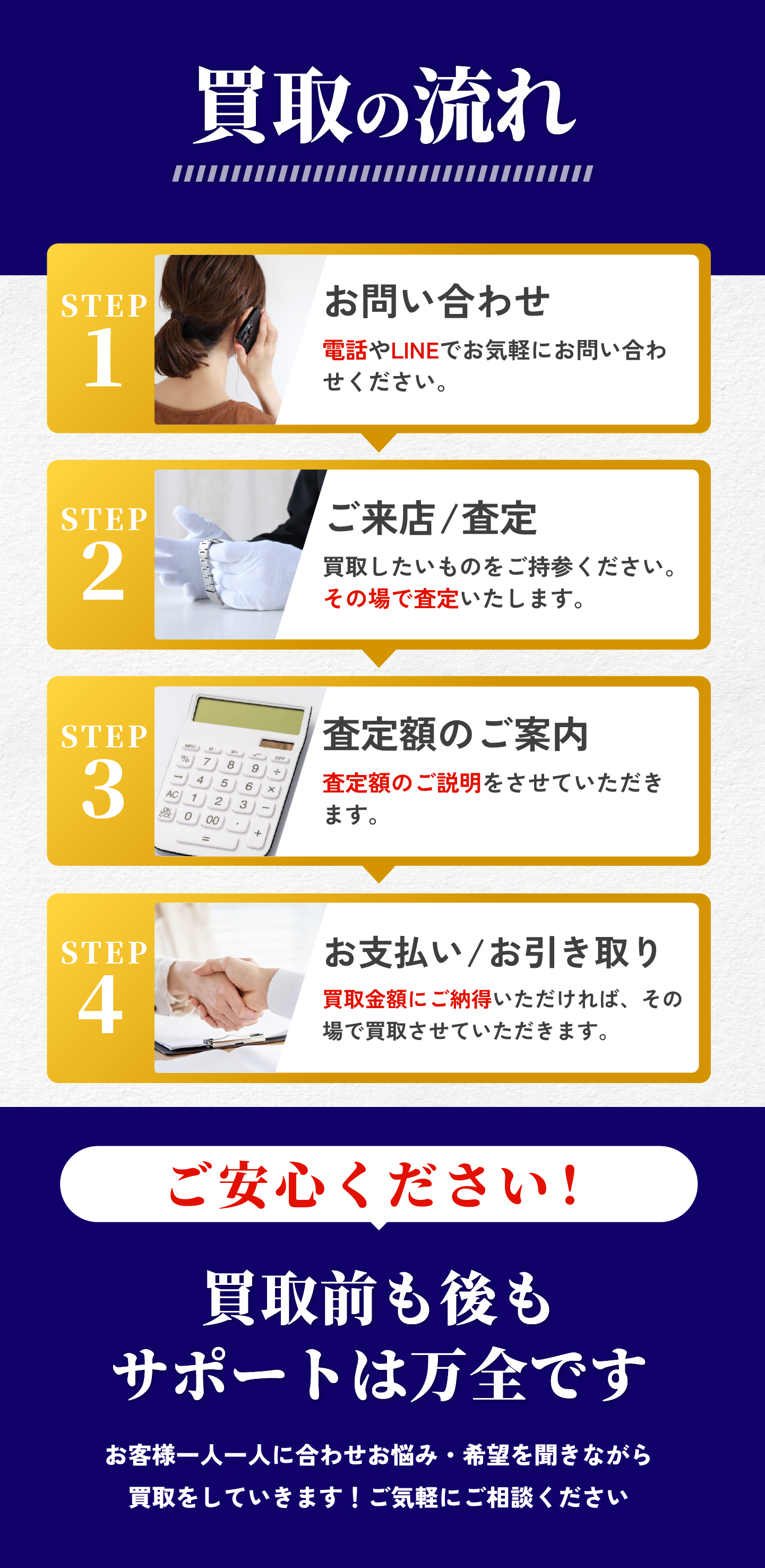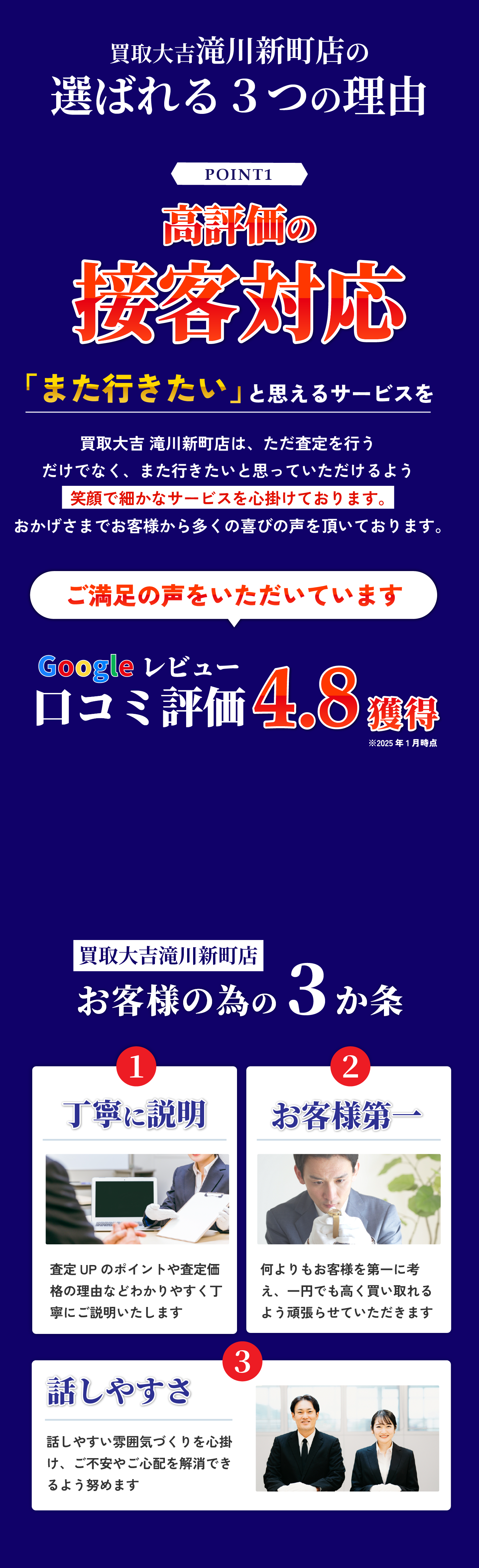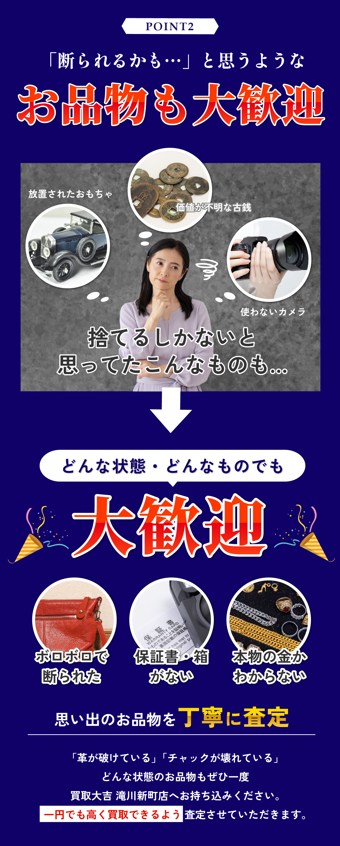 買取大吉 滝川新町店 (以下「当社」)は、以下のとおり個人情報保護方針を定め、 個人情報保護の仕組みを構築し、全従業員に個人情報保護の重要性の認識と取組みを 徹底させることにより、個人情報の保護を推進致します。 個人情報の管理 当社は、お客さまの個人情報を正確かつ最新の状態に保ち、個人情報への不正アクセス・紛失・破損・改ざん・漏洩などを防止するため、セキュリティシステムの維持・管理体制の整備・社員教育の徹底等の必要な措置を講じ、安全対策を実施し個人情報の厳重な管理を行ないます。